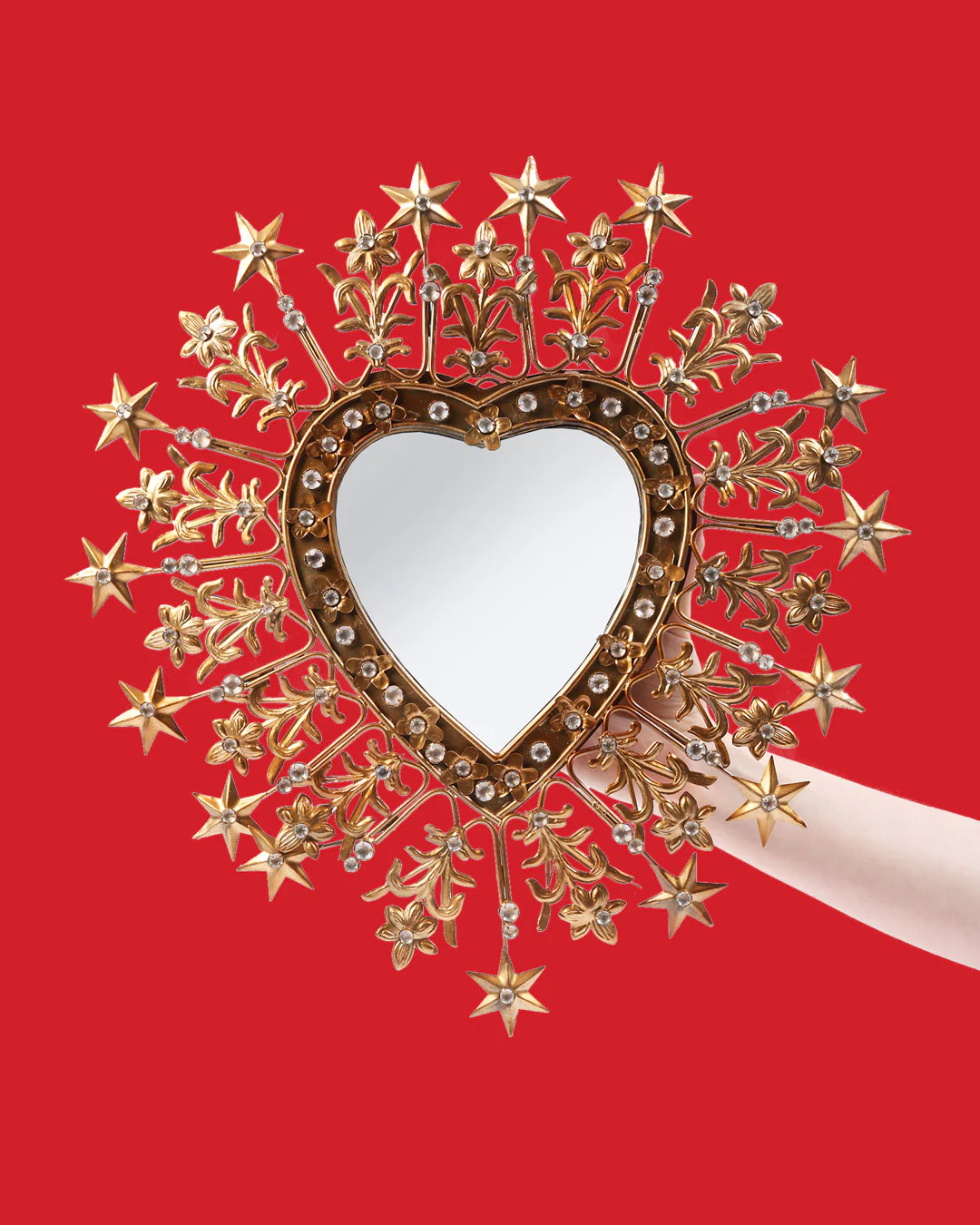 Inspired by the enchanting 'sacred heart' depicted in religious artwork, this stunning mirror is shaped like a heart and surrounded by a burst of stars adorned with gems and crafted from a mix of embossed and intricately cut tinplate.