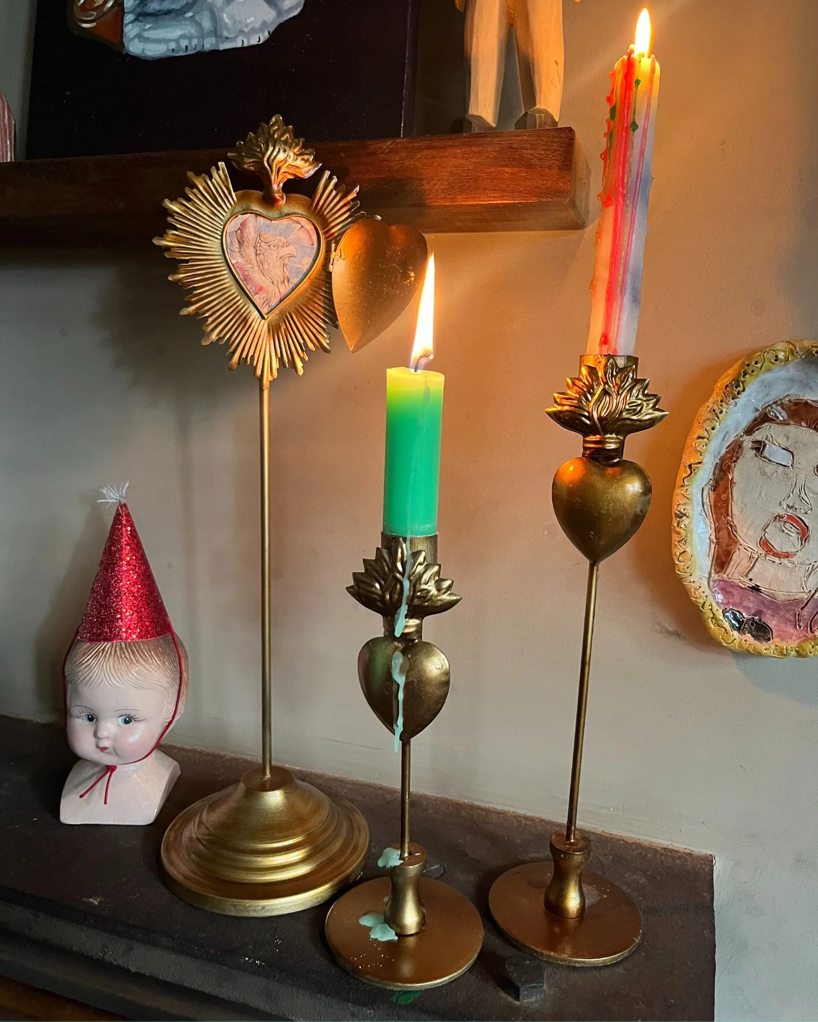 Inspired by religious art, this dreamy pair of candlesticks feature the flaming 'sacred heart' in a golden finish.Â