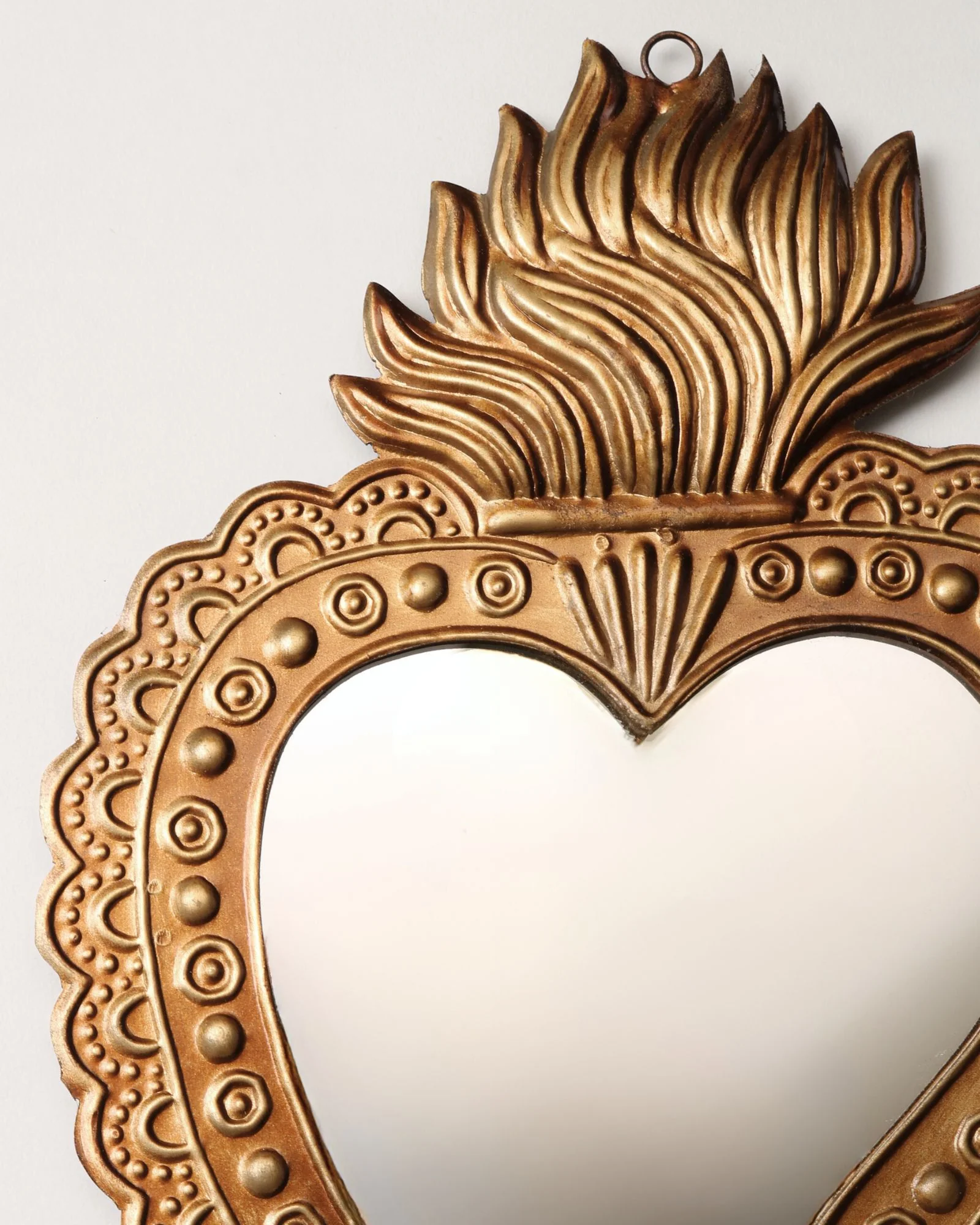 Lovely golden scallop edged heart mirror with flame details. Hang individually, or mix with more pieces from our collection of milagros and ex-votos for a dazzling display!Â
