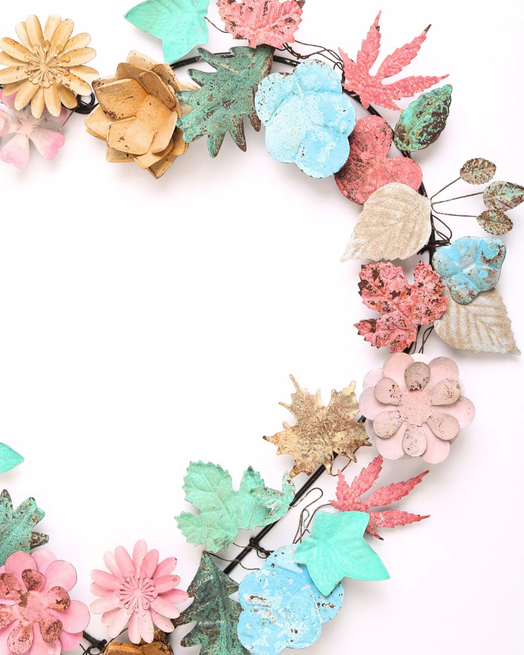 Gorgeous metal floral heart shaped door or wall wreath, lovely rustic antique aged details, can be hung with twine or a large matching ribbon or directly onto a nail, the leaves and flowers can be bent into shape / design of choice, I had a lot of fun arranging my wreath for these pictures. This also looks fantastic with wire fairy lights twined in amongst the leaves and flowers, stunning over a fire place or on a front door.   Â